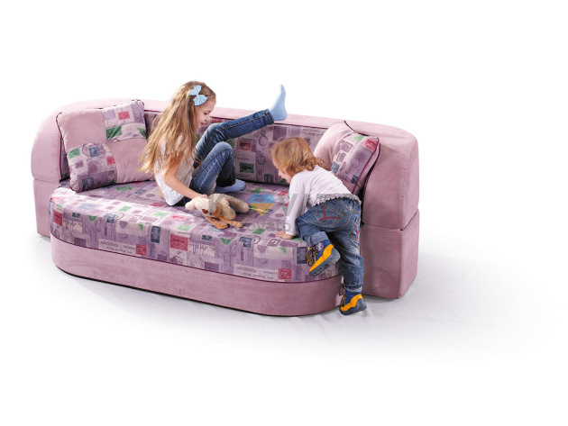 Корпус дивана изготовлен из эластичного пенополиуретана повышенной жёсткости (марка EL 25.40), который обеспечивает правильную поддержку во время сна и отдыха. В комплект входят две декоративные подушки, добавляющие уюта. Отсутствие острых углов, твёрдых вставок и пружин делает эту модель абсолютно травмобезопасной даже для самых активных детей.