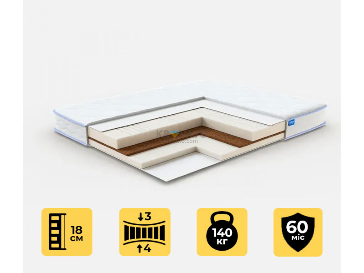 Наповнення матраца включає високоеластичну піну Ortho-Schaum та латексовану кокосову койру, які забезпечують еластичність, повітропроникність та довговічність. Чохол виготовлений з стрейч-жакардової тканини глибокої прошивки, що забезпечує м'якість та приємні тактильні відчуття. Матрац має знімний чохол для зручності догляду.