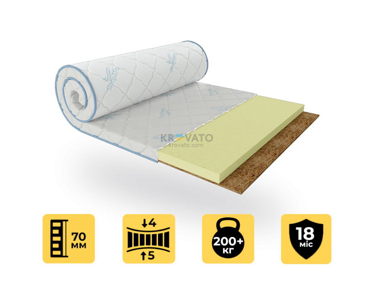 Цей топер має висоту 7 см і відрізняється особливим дизайном з двосторонньою жорсткістю. Одна сторона оснащена латексованою кокосовою койрою, яка додає необхідної жорсткості, а інша — високощільною ортопедичною піною, що надає комфорт і підтримку. Ортопедична піна, на відміну від поролону, не вбирає запахи та вологу і має тривалий термін служби — понад 10 років. Завдання цього топера — вирівняти поверхню старого дивану або матраца, додаючи жорсткості і забезпечуючи комфортний сон. Це зручне рішення для коригування жорсткості спального місця, де ви зможете регулювати рівень комфорту, вибираючи одну з двох сторін топера.