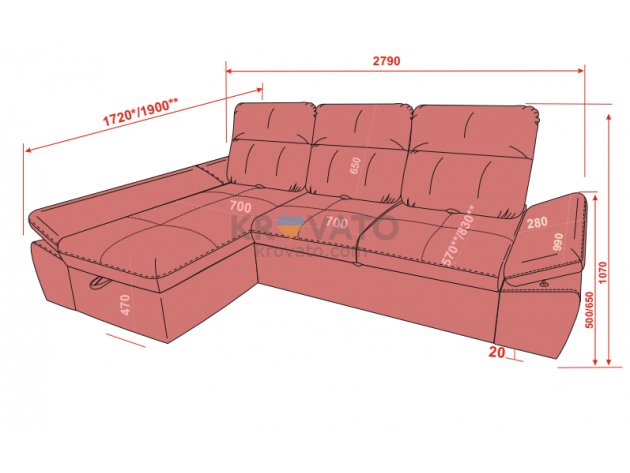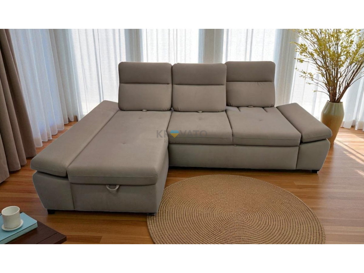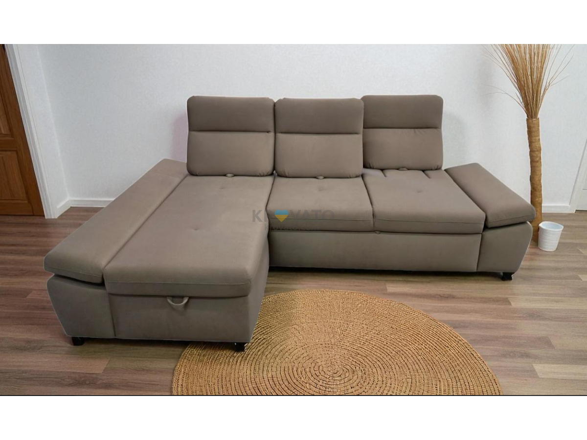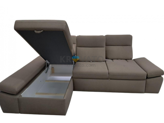 Практичність моделі підкреслює наявність місткої ніші для білизни, де легко розмістяться подушки, ковдри чи пледи. Задня спинка і навіть викатна частина виконана в основній тканині, що дозволяє ставити диван не тільки біля стіни, але і в центрі кімнати - він однаково стильно виглядає з будь-якого боку.