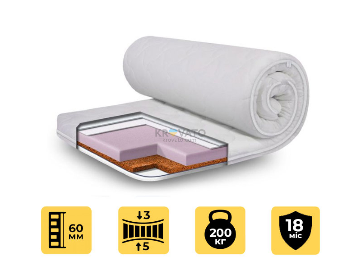 Cocos — універсальний і бюджетний вибір для вирівнювання спального місця та додаткової підтримки. Простий у догляді, компактний при зберіганні, оптимальний для дому, гостей чи орендованої квартири.