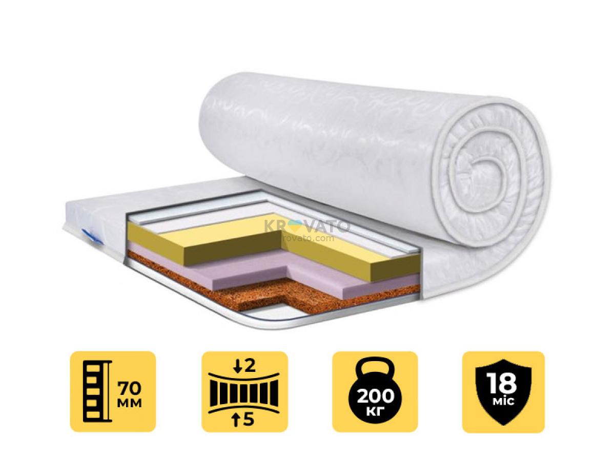 | Наповнення | Жаккард • Синтефлекс • Спанбонд • Memory Foam 3 см • AiryFoam 2 см • Кокос + латекс 1 см • Спанбонд • Синтефлекс • Жаккард |