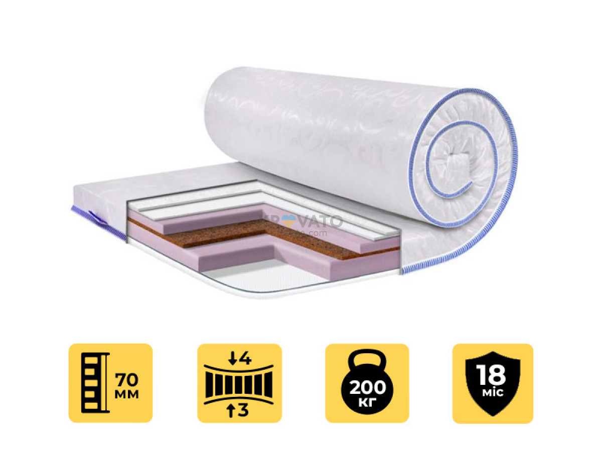 | Наполнение | Синтепон; Спанбонд; AiryFoam 3 см; кокос + латекс 1 см; AiryFoam 2 см; Спанбонд; Синтепон |