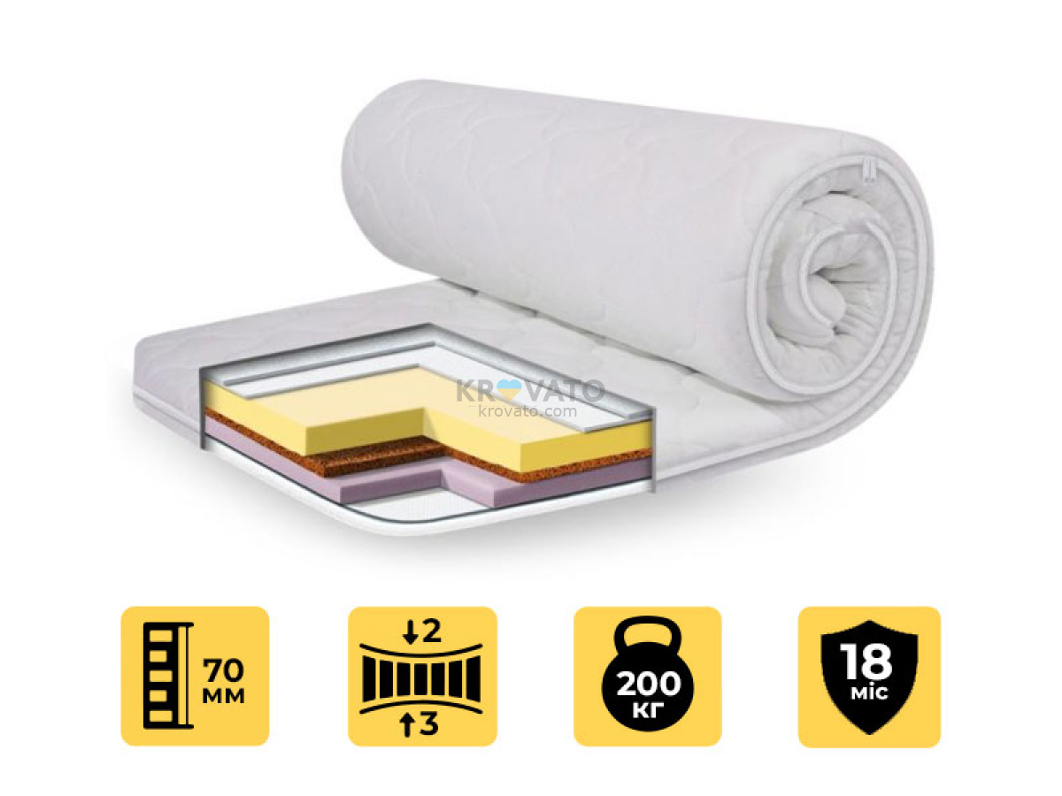 Memory‑Cocos 3в1 Трикотажный чехол — двухсторонний тонкий топпер‑футон высотой 7 см с комбинированным наполнением: 3 см мягкой Memory Foam, 1 см кокосового волокна с натуральным латексом для умеренной жесткости и 2 см упругой AiryFoam для вентиляции и поддержки.