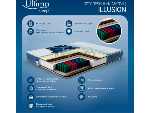 Матрац Illusion від українського бренду Daniro — це пружинний ортопедичний матрац, який поєднує інноваційні матеріали та сучасні технології для забезпечення максимального комфорту та здорового сну. Його висота становить 23 см, а рівень жорсткості — підвищений, що забезпечує оптимальну підтримку тіла.