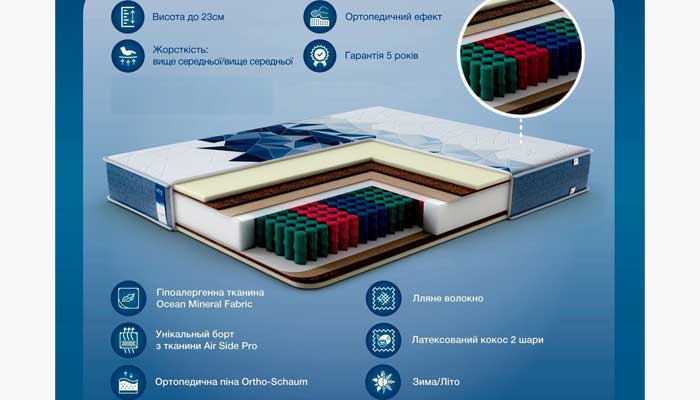 Наповнення матраца включає ортопедичну піну Ortho-Schaum, латексовану кокосову койру та лляне волокно, які забезпечують еластичність, повітропроникність та довговічність. Чохол виготовлений з тканини Ocean Mineral Fabric з унікальним бортом Air Side Pro, що забезпечує м'якість та приємні тактильні відчуття. Матрац має ефект "Зима-Літо" для зручності використання в різні пори року.