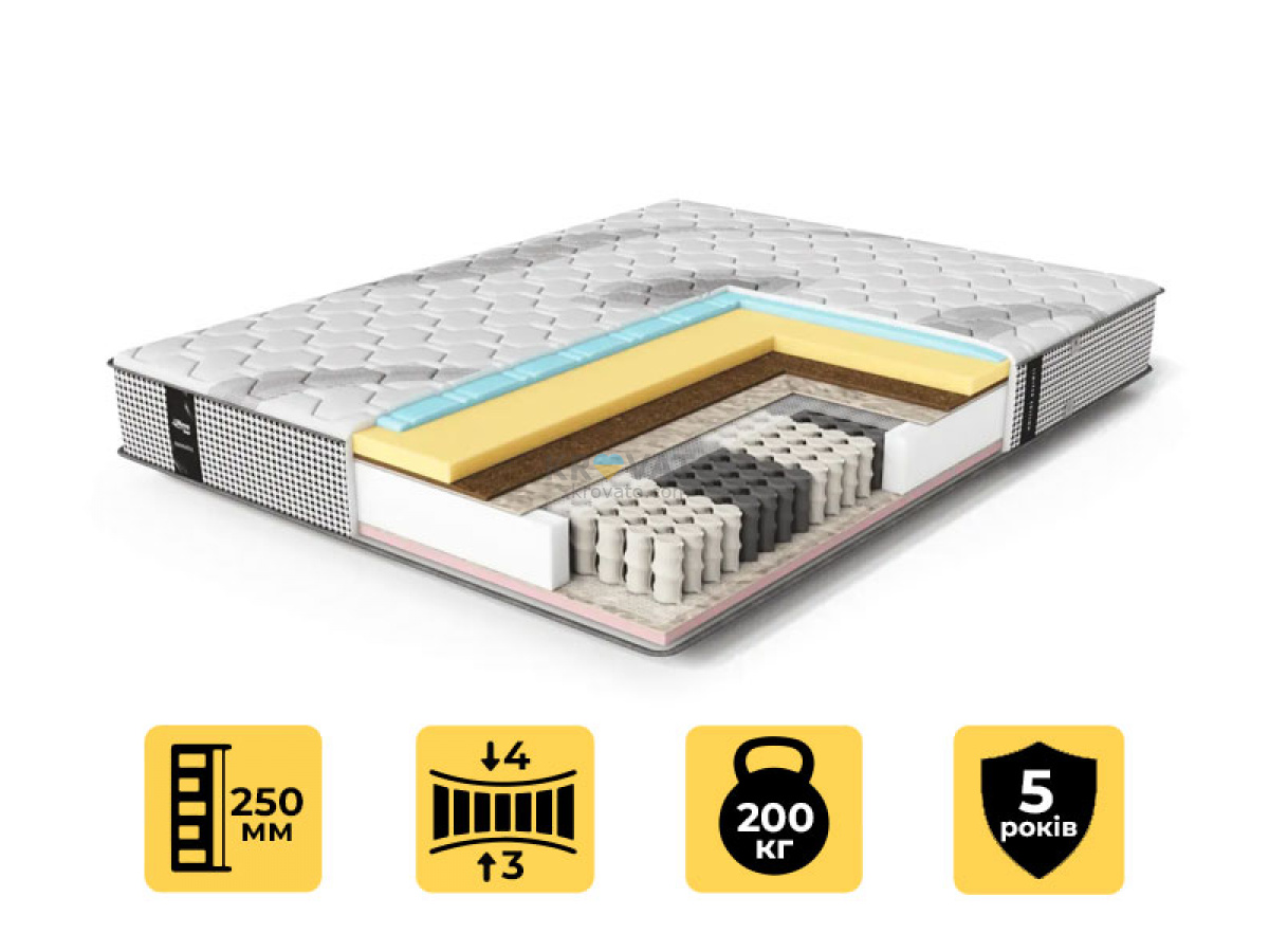 Матрас Damiano от украинского бренда Ultima Sleep — это сочетание инновационных технологий и натуральных материалов для обеспечения здорового и комфортного сна. Его основа — независимый пружинный блок Multi Carbon Pocket Spring 9 Zone, который обеспечивает точечную поддержку тела и снижает нагрузку на позвоночник.