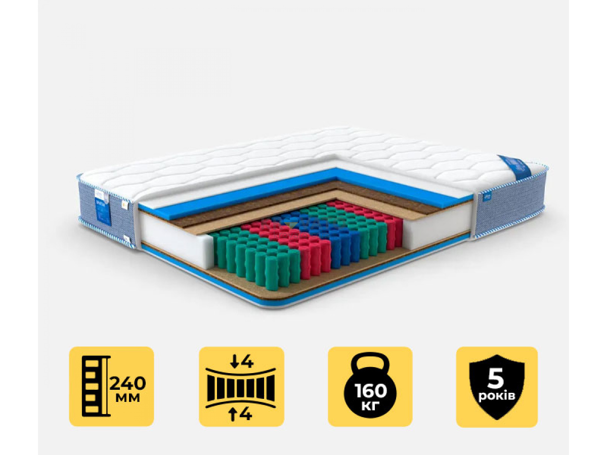 Матрас Spartak от украинского бренда Daniro — это пружинный ортопедический матрас, который сочетает инновационные материалы и современные технологии для обеспечения максимального комфорта и здорового сна. Его высота составляет 24 см, а уровень жесткости — повышенный, что обеспечивает оптимальную поддержку тела.