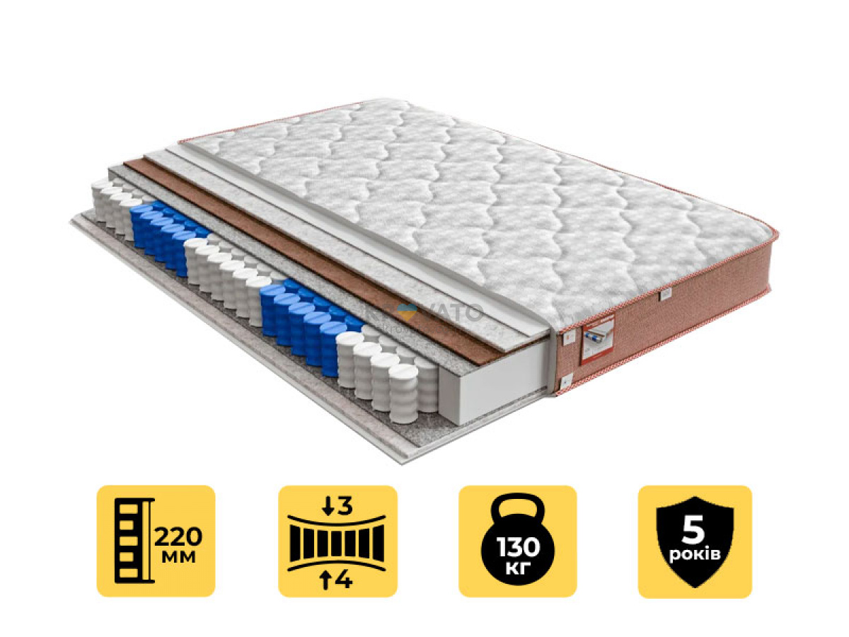 Латексована кокосова койра додає конструкції необхідної жорсткості, сприяє правильному положенню хребта, а також підвищує загальну вентиляцію матраца.