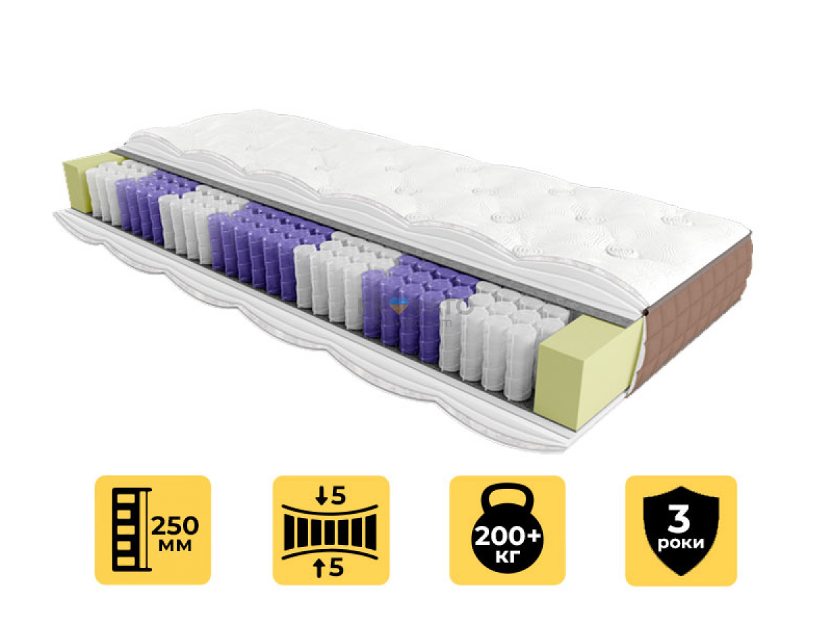 Матрац Veda від українського виробника EMM — це преміальна модель з високим рівнем жорсткості (5/5), яка забезпечує оптимальну підтримку тіла та комфорт під час сну. Його висота становить 25 см, а завдяки використанню 7-зонального пружинного блоку Premium PS 7-zone hard, матрац адаптується до анатомічних особливостей тіла, забезпечуючи правильне положення хребта.