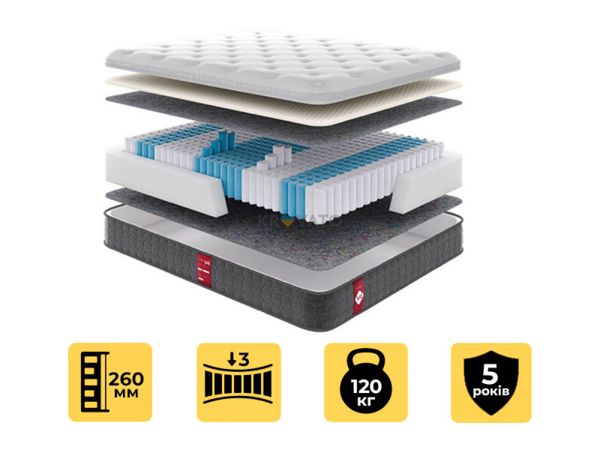Піклування про опорно-руховий апарат — ще одна важлива перевага. В основі моделі — семизонний пружинний блок Pocket Spring Sky 7, що адаптується до контурів тіла, рівномірно розподіляє навантаження та підтримує правильне положення хребта.