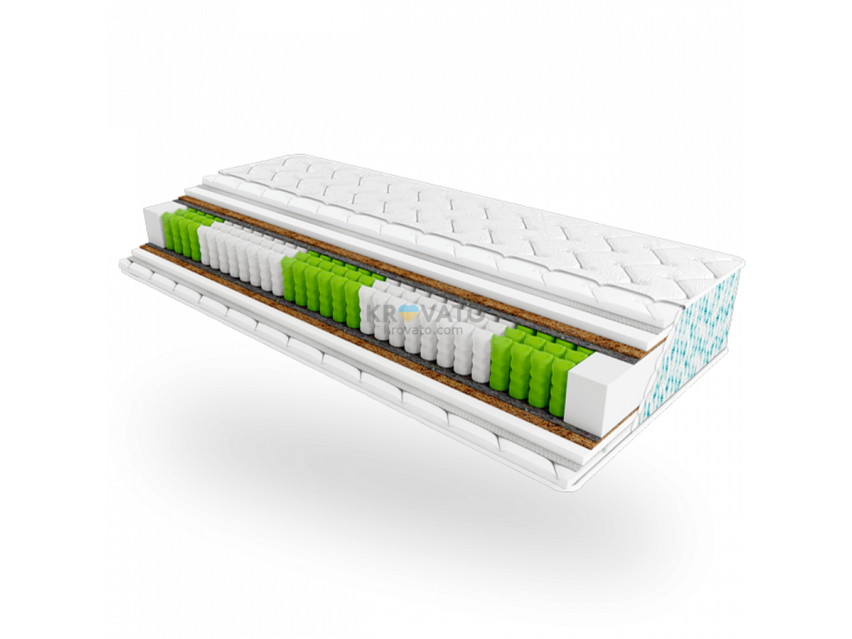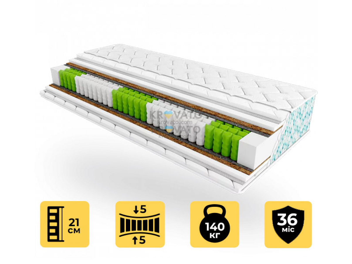 Наповнення поєднує піни з середньою пружністю і натуральну кокосову койру — збалансоване рішення для комфорту й жорсткості. Койра додає вентиляції і покращує довговічність шарів.